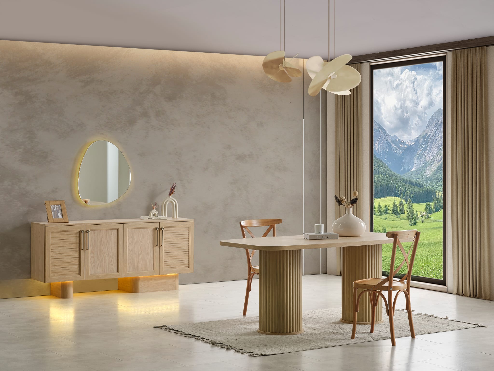 - Özgün Yemek Masası: Masif ahşap görünümlü dikdörtgen tablası ve altında yer alan yuvarlak, dikey oluklu (fitilli) ayaklar ile modern ve heykelsi bir görünüm sunar. Bu tasarım, mekana sofistike bir doku katar.